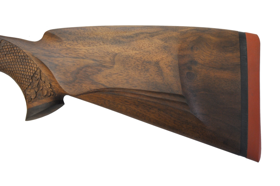 We have developed a new walnut stock with a quick-change rubber cap system. This eliminates the problem with the length of the stock in winter when you are dressed more “thickly”. Simply replace the thicker rubber cap with the supplied thinner one. On the stock and on the butt cap are carved fish scales with oak leaves. The stock is protected in oil. The rifle mechanism has been disassembled, inspected and cleaned. The barrels are in excellent condition and have been re-blued.