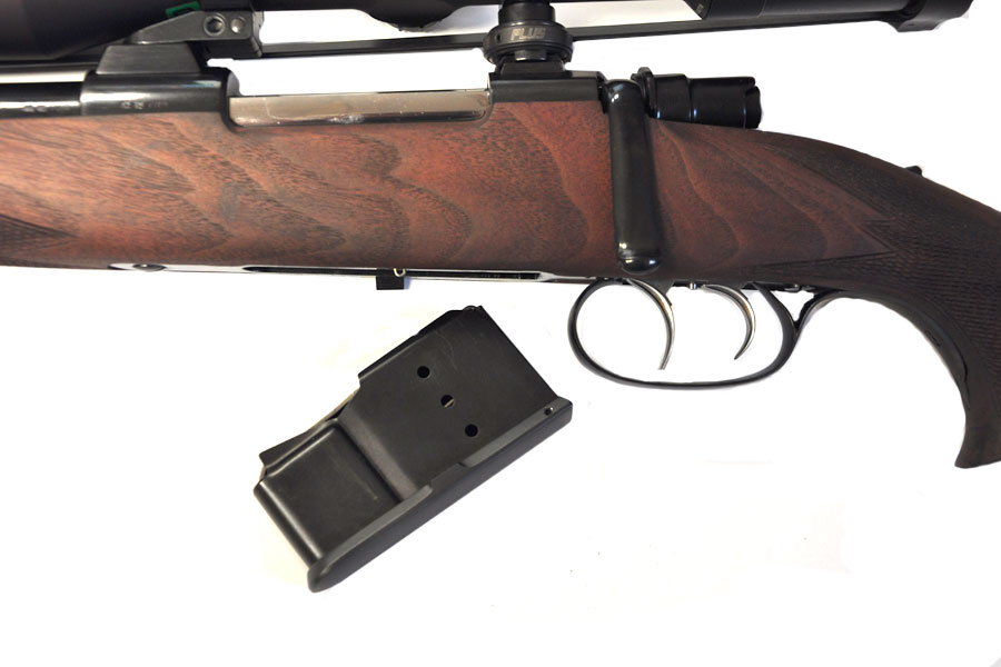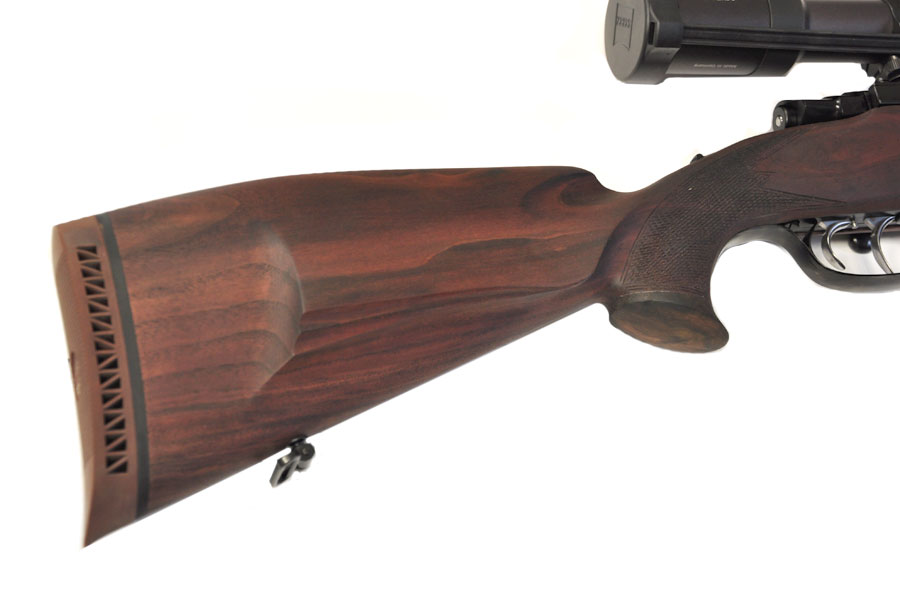 The stock is made to order for left-handed shooters from quality walnut wood, finished with a rubber cap and a wooden finish on the pistol grip. The stock is Bavarian with a semi-lead back. The fish skin is grained on the pistol grip and on the fore-end of the stock. The stock is protected with a special dark matt oil.