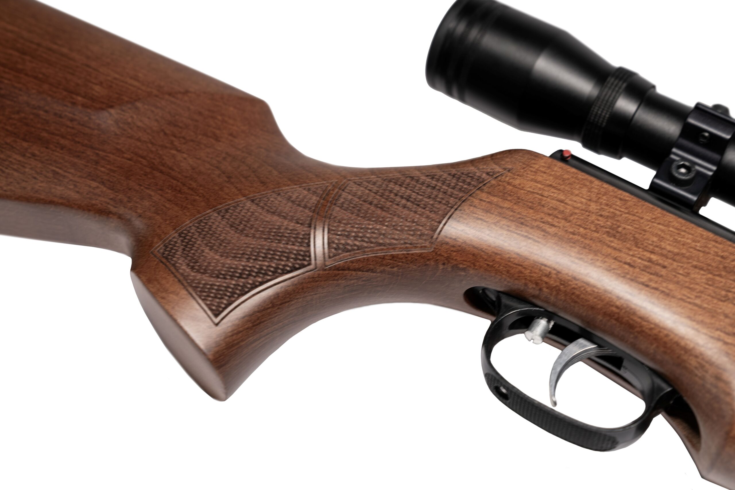 Ergonomsko oblikovano kopito iz trdega lesa z orehovim zaključkom, nedrseča rezkana tekstura na pištolskem ročaju in prednjem delu kopita ter gumijasta ramenska kapa za udobno in stabilno streljanje.