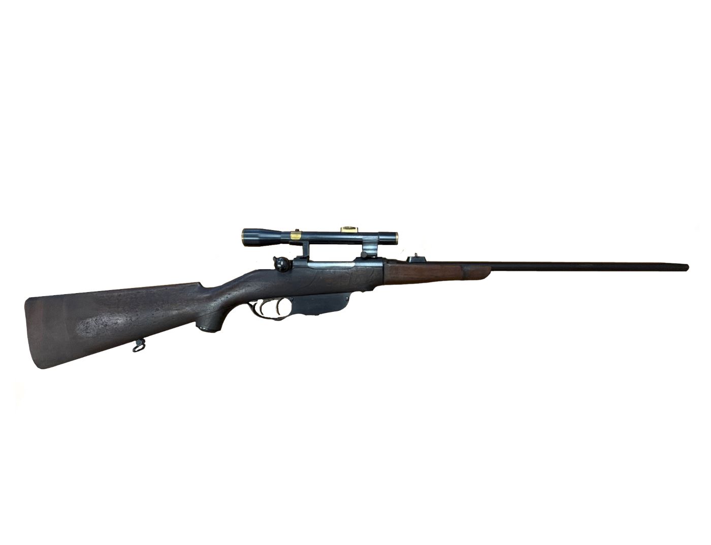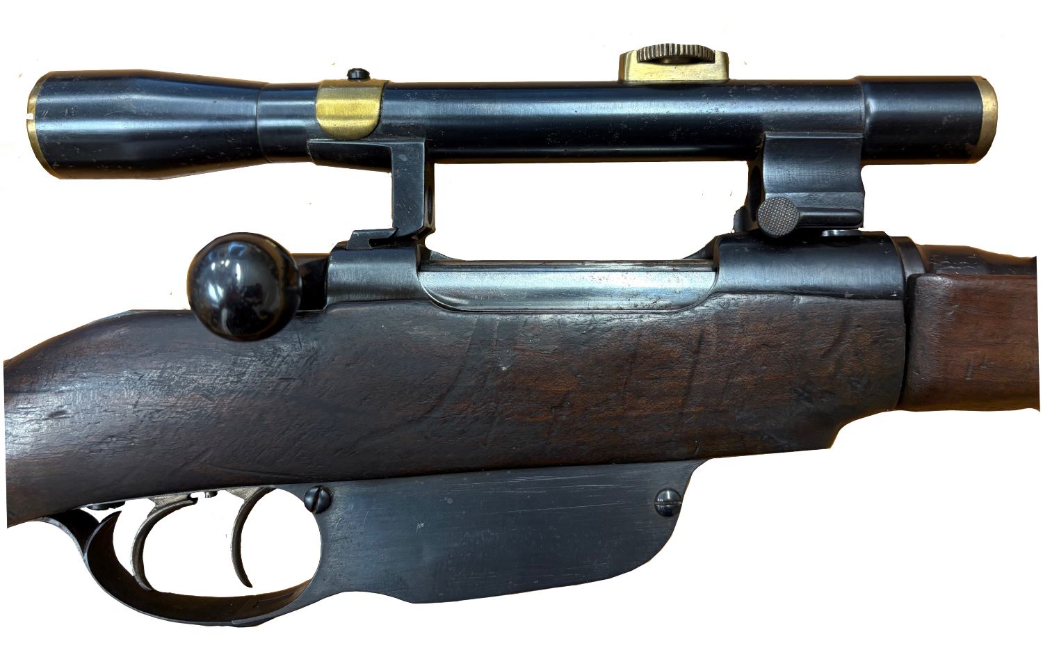 Onesposobljena puška Mannlicher Schoenauer skupaj z daljnogledom.
