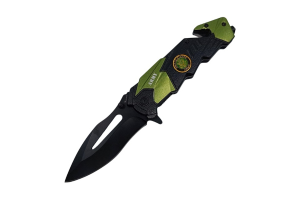 Preklopni nož 18127 US Army zeleno/črn: Moč, zanesljivost in tradicija V svetu pustolovcev, vojakov in ljubiteljev narave obstaja nekaj, kar presega zgolj praktičnost in funkcionalnost – to je duh pripadnosti, močne volje in tradicije. Preklopni nož 18127 US Army, izdelan z ljubeznijo do podrobnosti in zanesljivosti, prinaša prav to – moč, zanesljivost in spoštovanje do tradicije. Ko držite ta nož v rokah, začutite zgodovino, ki ga obdaja. Izdelan iz kakovostnih materialov in zasnovan z uporabnikom v mislih, je ta nož več kot le orodje – je simbol moči in odločnosti, ki je vedno z vami. Z rezilom, ki se ponaša z ostrino in vzdržljivostjo, ter ročajem, ki omogoča udoben oprijem v vsaki situaciji, je preklopni nož 18127 US Army narejen za soočanje z izzivi, ne glede na to, kako zahtevni so. Nož ima konico za razbijanje stekel in rezilo za rezanje varnostnih pasov. Varovalo pred zapiranjem poskrbi, da ne pride do poškodb.