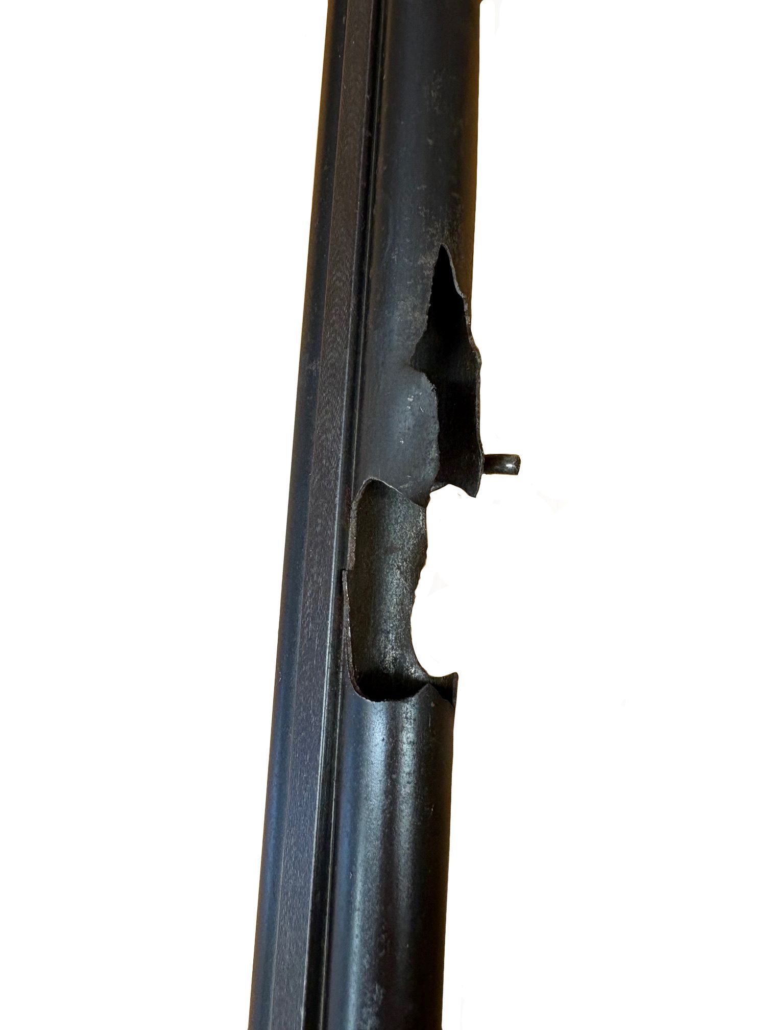 Kot je razvidno iz fotografije, je bil v desni cevi ob strelu tujek, zato je cev raztrgalo.