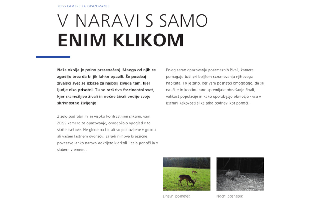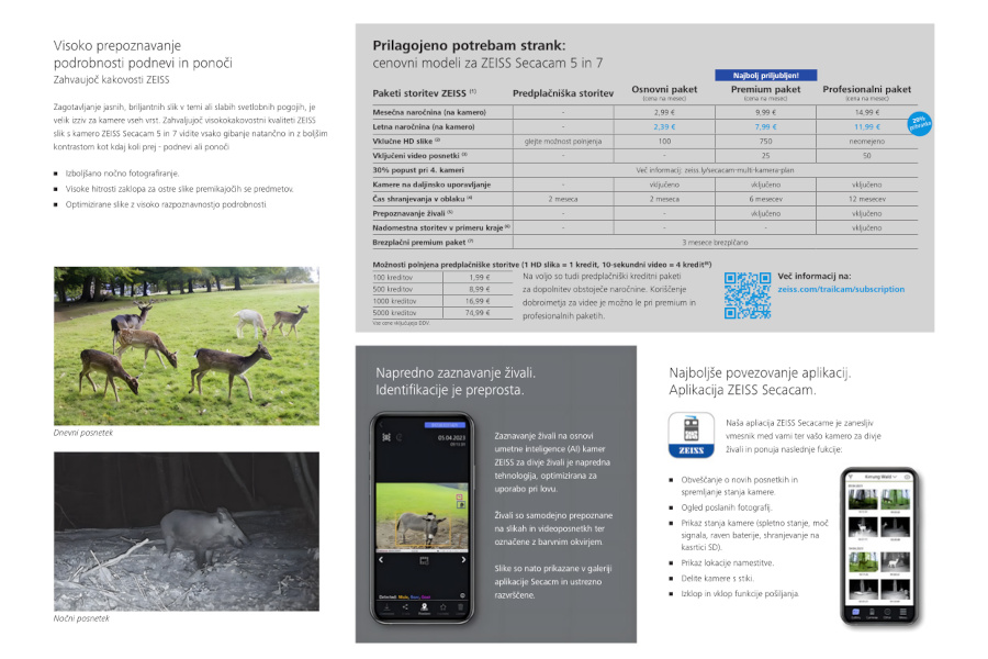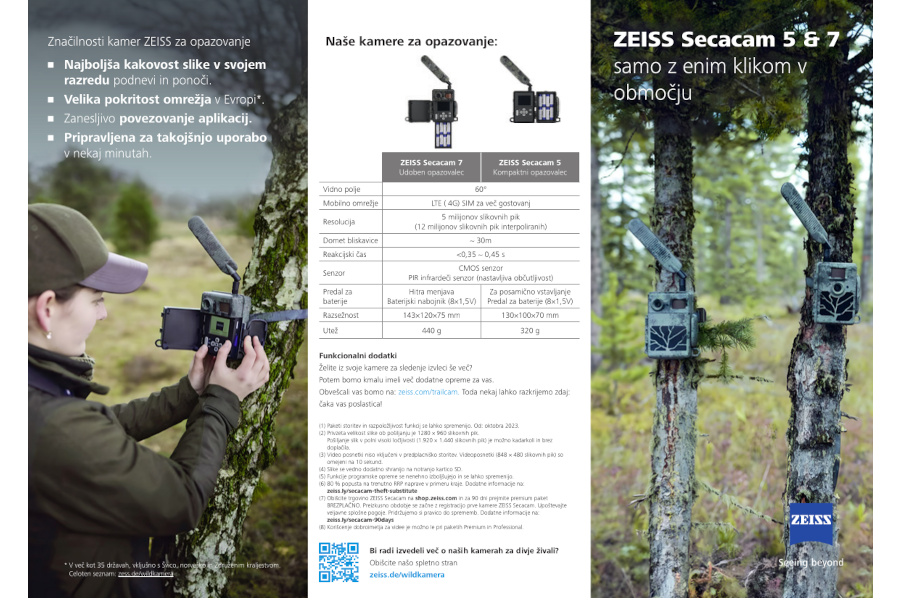 Kamere za sledenje so postale nepogrešljiva oprema za lov. Omogočajo zanesljivo sledenje posameznim živalim in njihovemu gibanju v vašem lovišču. Za jasno identifikacijo divjadi je ključnega pomena kakovost snemanja sledilne kamere. Predvsem nočno gledanje predstavlja izziv, saj mora biti čim večja možna površina osvetljena z najmanjšo možno obremenitvijo baterije. ZEISS-ove kamere za sledenje vam omogočajo vpogled v te skrite svetove prek podrobnih in visoko kontrastnih slik.